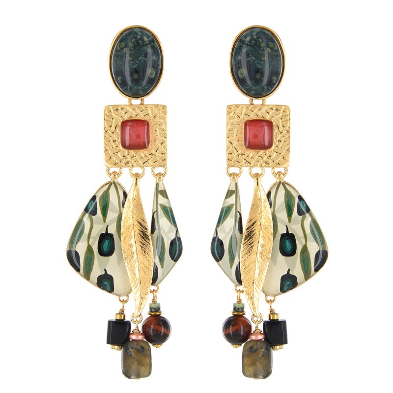 Composition : Etain, Résines colorées dont les motifs sont peints à la main, Résine transparente, Poudre de mica, Jaspe Kambaba, Oeil de tigre teinté, Labradorite, Zoïsite, Hématite teintée, Agate teintée, Laiton doré à l’or fin sans nickel et traité contre les allergies.