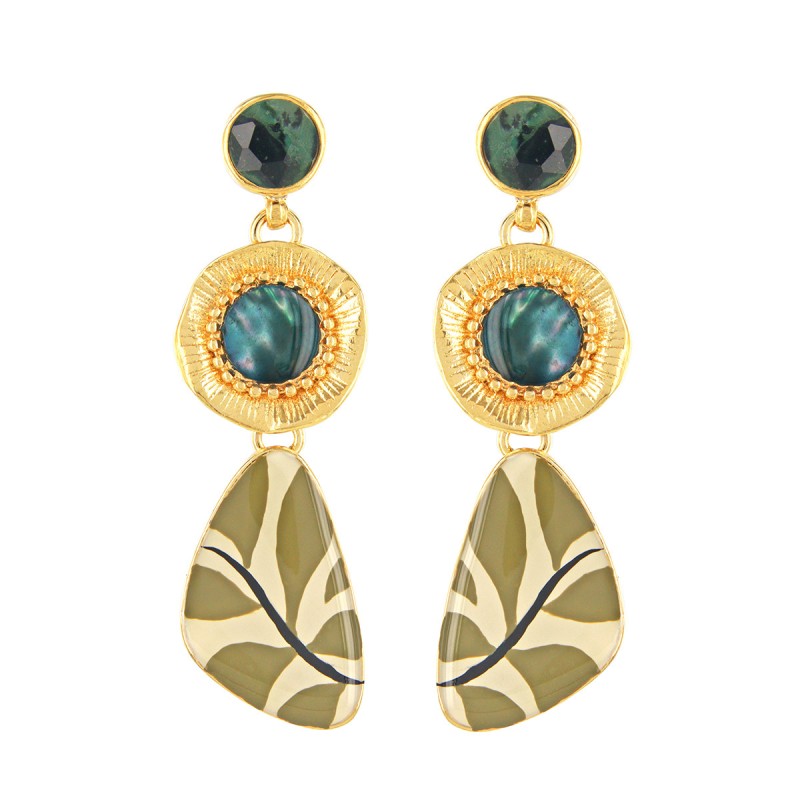 Composition : Étain, Résines colorées dont les motifs sont peints à la main, Coquille d’abalone, Jaspe kambaba, Laiton sans nickel et traité contre les allergies.
