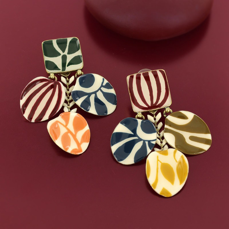 Composition : Etain, Résines colorées dont les motifs sont peints à la main, Laiton doré à l’or fin sans nickel et traité contre les allergies.
