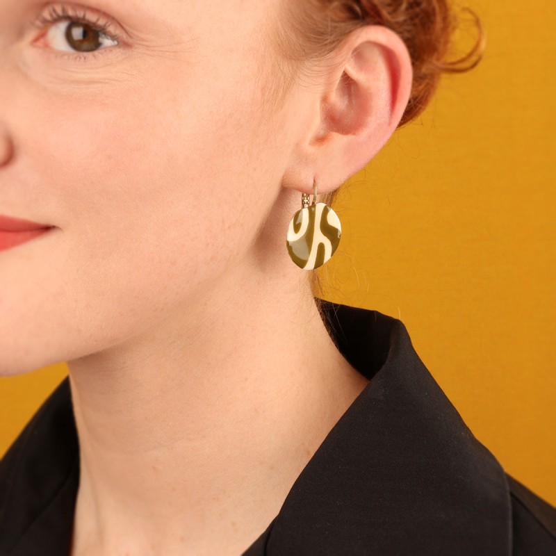 Composition : Résines colorées dont les motifs sont peints à la main, Etain, Laiton sans nickel et traité contre les allergies.
