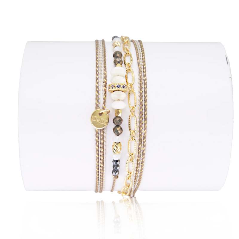 Bracelet ajustable multi tours Calypso signé Loetma composé de Pierres en Nacre et réhaussé d’une roue incrustée de Zircon.