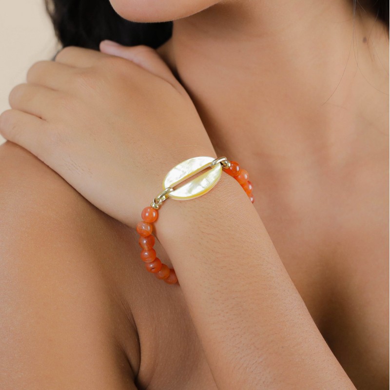 Bracelet Extensible Ellipse signé NATURE bijou composé de Nacre dorée et de Cornaline.