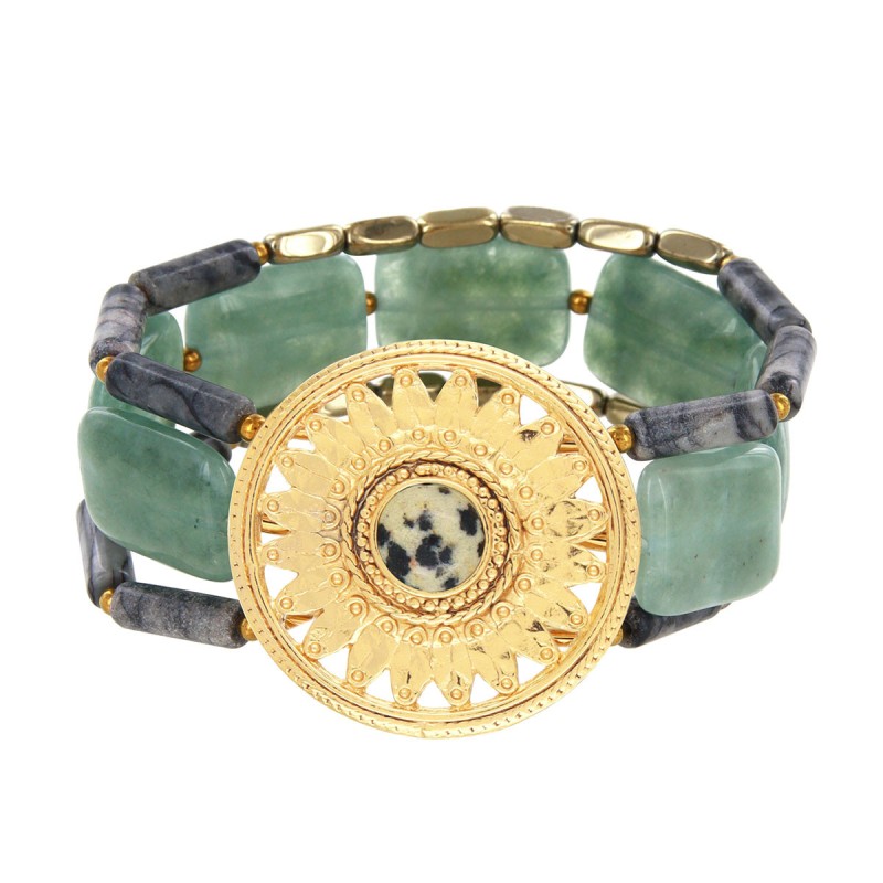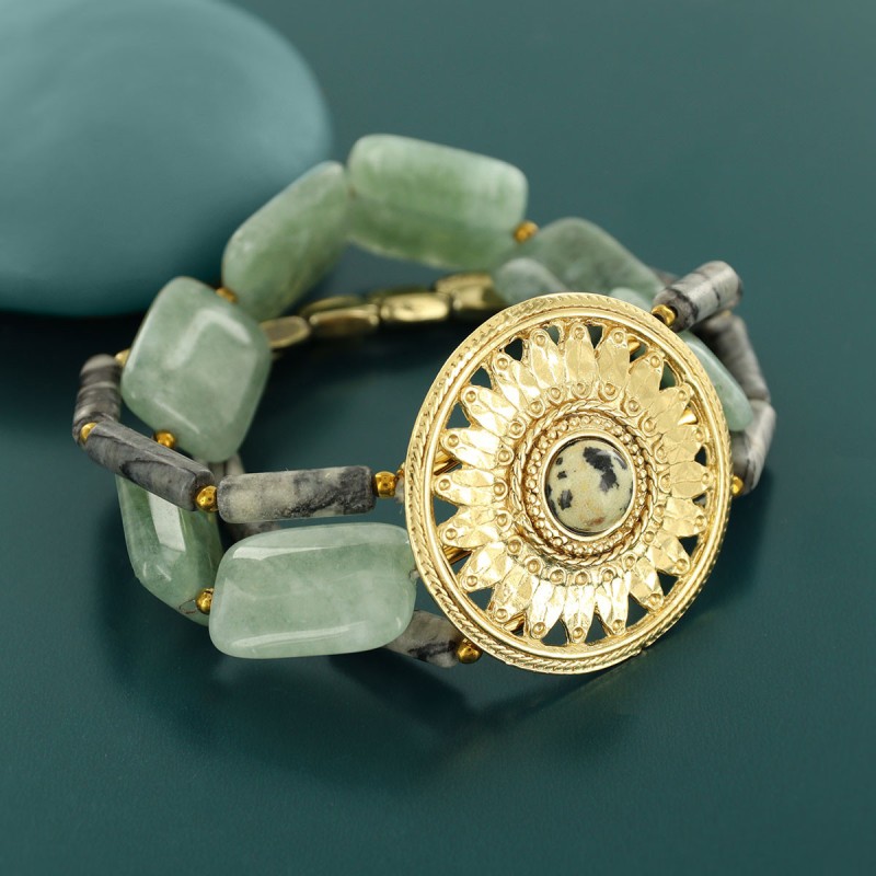 Composition : Jaspe dalmatien, Jaspe Netstone, Perle en Jade, Hématite dorée, Etain, Laiton sans nickel et traité contre les allergies.