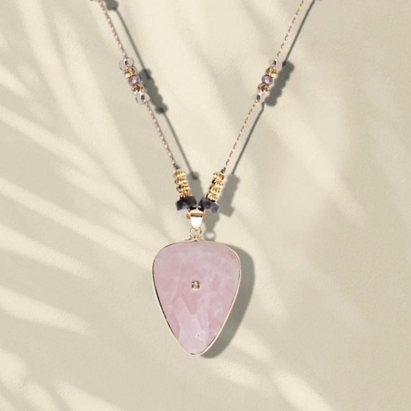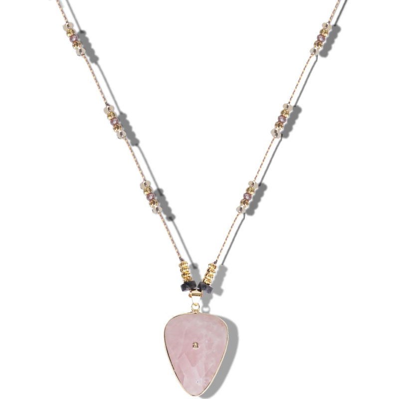 Collier Sautoir Shardana signé Loetma composé d’un cordon ajustable sur lequel est suspendu une pierre de Quartz rose. Une petite pépite dorée l'accompagne, ajoutant une touche de préciosité à cette pièce unique. Des petites rondelles striées dorées, des perles de verre et de petites pierres semi-précieuses viennent se mêler harmonieusement, créant un ensemble féerique.