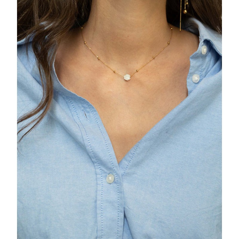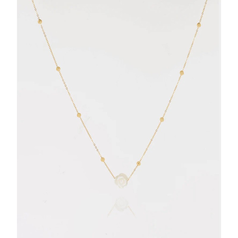 Collier Soen signé ZAG Bijoux serti de billes en acier le long de la chaîne et d'une nacre en forme de rose.