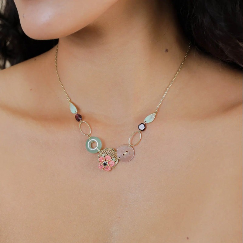 Collier Bridget signé FRANCK HERVAL composé de 7 éléments. Bridget met la broderie au centre de cette nouvelle collection. Sur un motif doré ultra-léger, la fleur en fil de coton explose en rose poudré, réveillée par des touches d’amazonite, d’aventurine et de grenat. Les boucles d’oreilles fleur brodée ce sont clairement ta signature : volume maîtrisé, mouvement cool, zéro lourdeur, c'est la paire qu’on remarque.