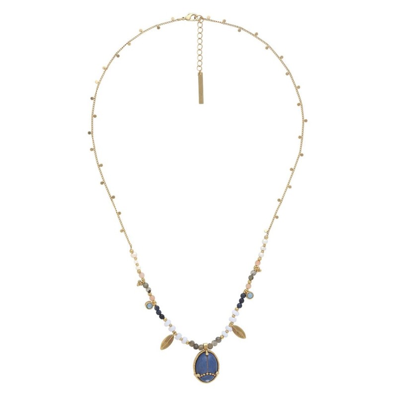 Composition : Calcédoine bleue, Labradorite, Lapis-lazuli, Perles de culture, Pierre de lune, Laiton doré à l’or 18K sans nickel et traité contre les allergies.