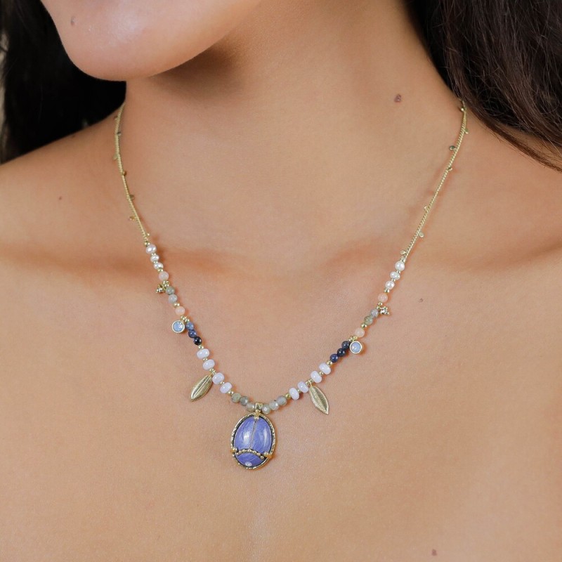 Cap sur l’Égypte, vous avancez entre dunes et Nil, les palmiers découpent la lumière et les scarabées murmurent porte-bonheur. La Créatrice a imaginé Palma comme un talisman moderne où l'abalone accroche des reflets sable rosé, le lapis lazuli allume un bleu roi profond et la calcédoine bleue apporte une fraîcheur d’oasis. Le laiton doré dessine des feuilles de palmier stylisées, des amulettes et de petites médailles qui font vibrer la peau.