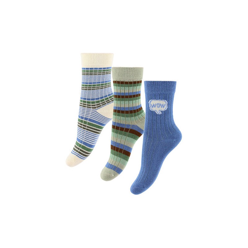 Lot de 3 Pack de chaussettes MiniPop uniques. Le lot contient des chaussettes à motif bleues, blanches, vertes et marron, ainsi qu’une chaussette bleue imprimé d’une bulle de dialogue avec le texte « WOW ». Les chaussettes MiniPop sont dotées d’une structure côtelée confortable et d’un bord élastique en haut.