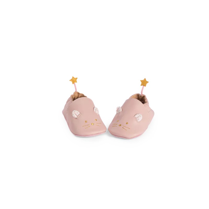 Chaussons en cuir avec fermeture élastiquée, brodés d’une souris dorée avec ses oreilles à pois. Ils sont doublés, souples, avec une semelle en cuir velours antidérapante et une semelle intérieure amovible avec mousse, pour le confort de bébé !