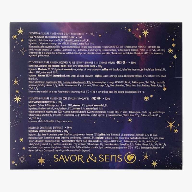 Coffret gourmand comprenant un moulin en verre rechargeable à sel, une moutarde, un tartinable et une huile Très beau cadeau pour les fins Gourmets!