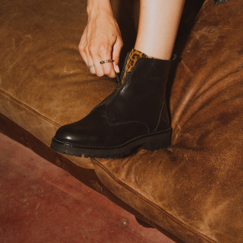 Affirmez votre style avec les bottines Dickson Cuir/Leo Noir, audacieuses et élégantes. En cuir lisse noir avec languette imprimé animalier, elles se distinguent par leurs zips latéraux pour un enfilage rapide. Leur tige de 13 cm, semelle crantée et talon de 3,5 cm allient confort et allure urbaine. Fabriquées au Portugal, elles se portent avec jean, robe midi ou pantalon cuir.