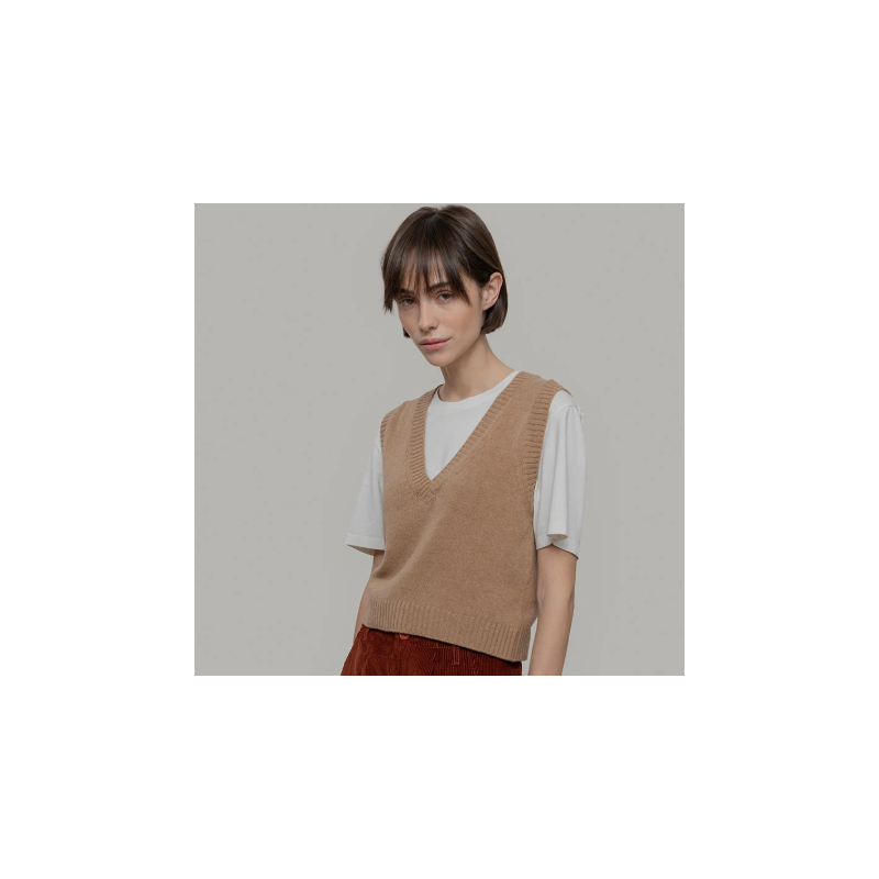 Melania est un gilet pour femme en 100 % laine recyclée, une matière durable et chaude. Son design épuré avec col en V et point jersey rend ce gilet facile à assortir, tandis que les finitions en côtes ajoutent structure et caractère.