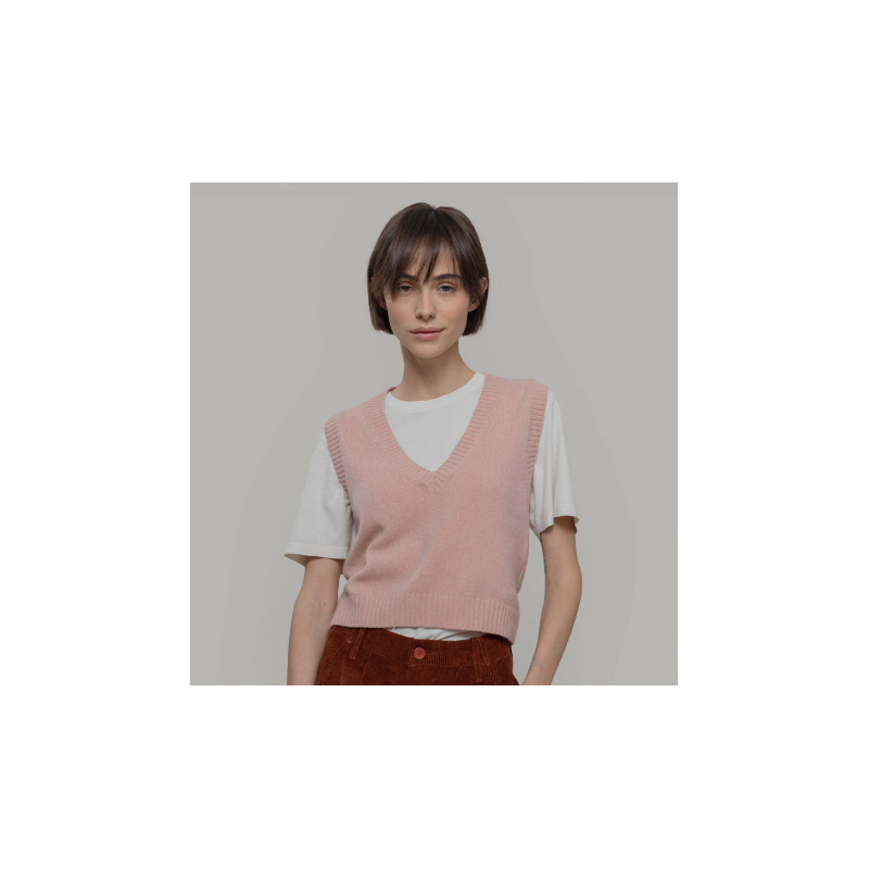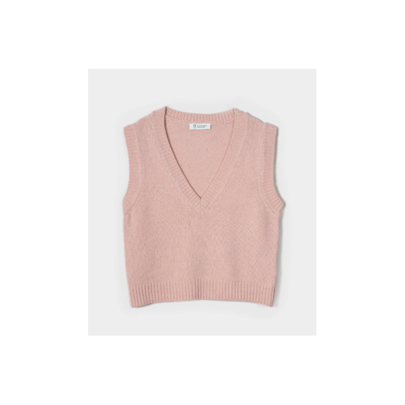Melania est un gilet pour femme en 100 % laine recyclée, une matière durable et chaude. Son design épuré avec col en V et point jersey rend ce gilet facile à assortir, tandis que les finitions en côtes ajoutent structure et caractère.