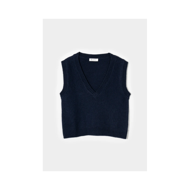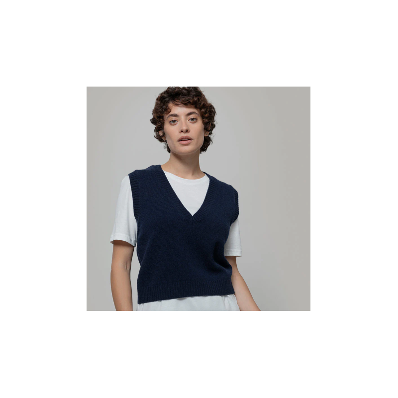 Melania est un gilet pour femme en 100 % laine recyclée, une matière durable et chaude. Son design épuré avec col en V et point jersey rend ce gilet facile à assortir, tandis que les finitions en côtes ajoutent structure et caractère.