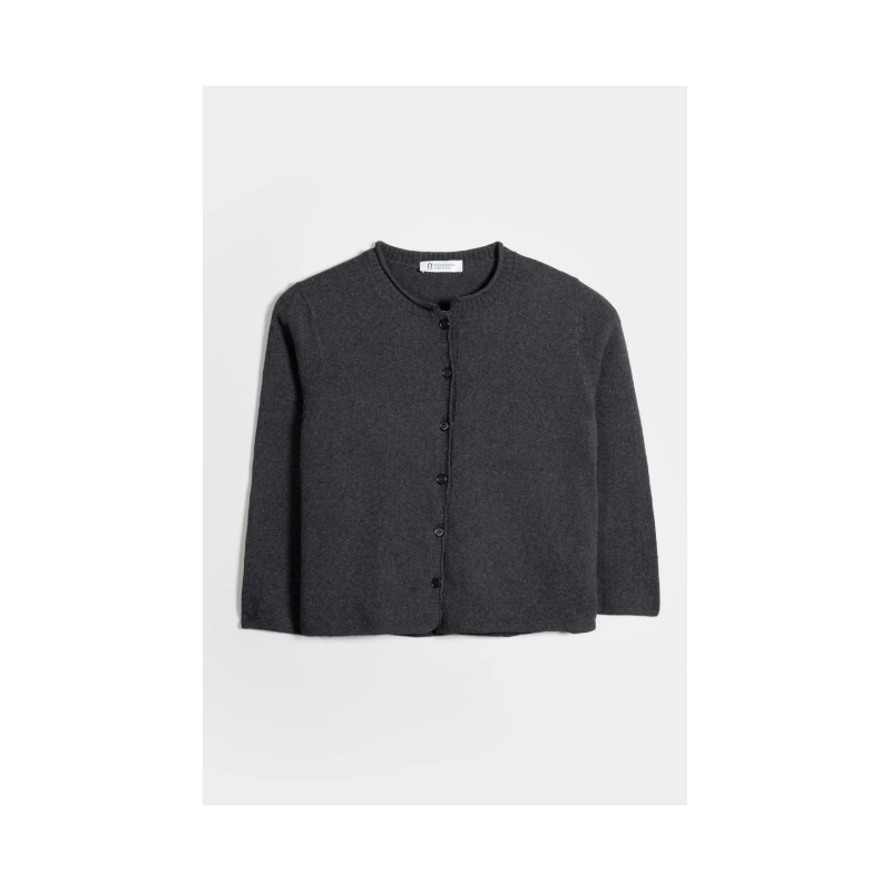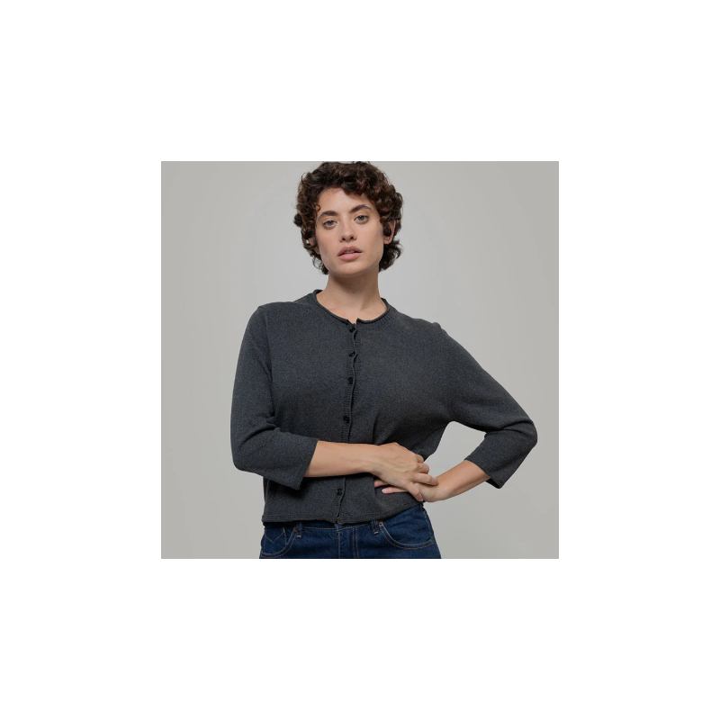 Cardigan court pour femme à manches longues, entièrement réalisé en fil de coton recyclé et biologique. Leda est un cardigan léger à col rond boutonné, parfait pour les mi-saisons. Le col, les poignets et le bas côtelées donnent une ligne droite au vêtement sans serrer.