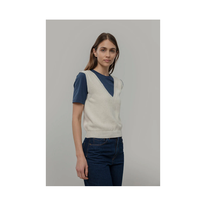 Elodie est un gilet en maille pour femme, fabriqué en 50 % coton recyclé et 50 % coton biologique, une matière durable, respirante et naturelle.