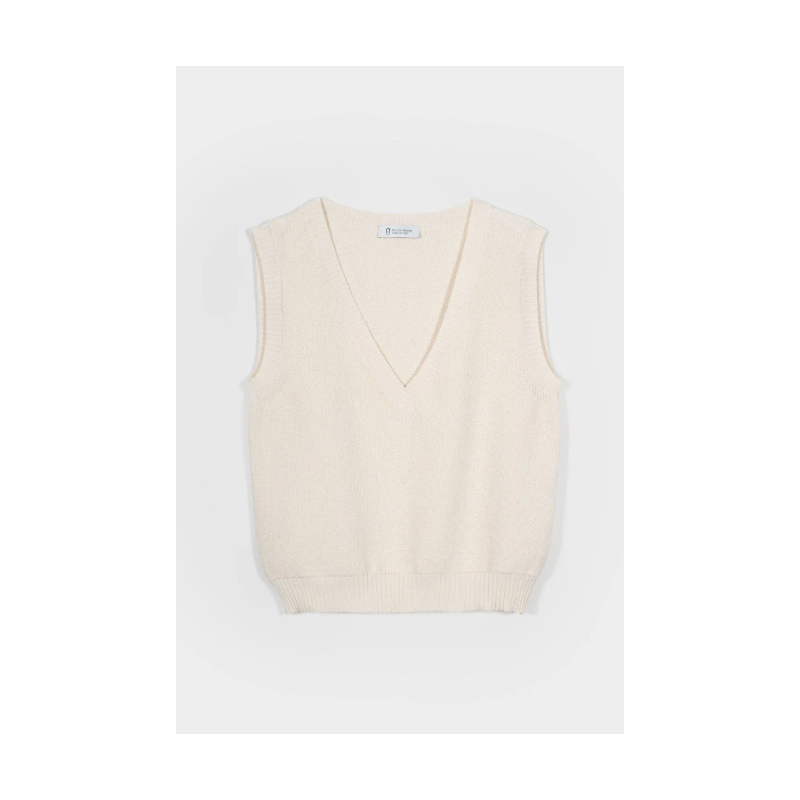 Le col en V et le point de tricot structuré rendent ce gilet élégant, tandis que les finitions en côtes ajoutent structure et caractère.