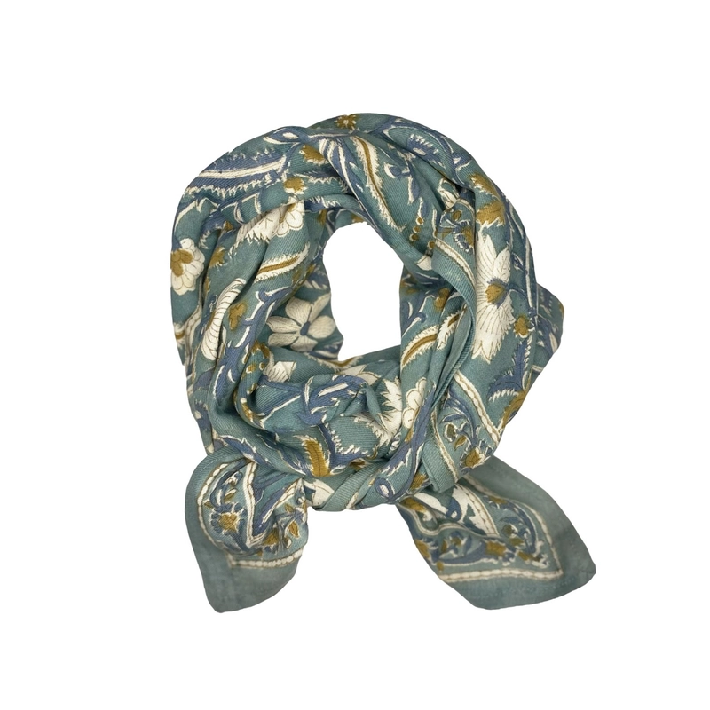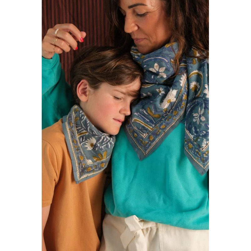 Ce foulard est confectionné artisanalement grâce à la technique indienne du block-print, les couleurs sont réalisées à partir de pigments naturels.