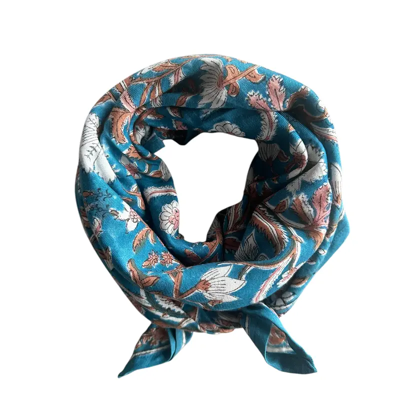 Ce foulard très souple et doux est confectionné artisanalement grâce à la technique indienne du block-print, les couleurs sont réalisées à partir de pigments naturels.