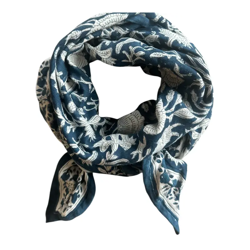 Ce foulard très souple et doux est confectionné artisanalement grâce à la technique indienne du block-print, les couleurs sont réalisées à partir de pigments naturels.