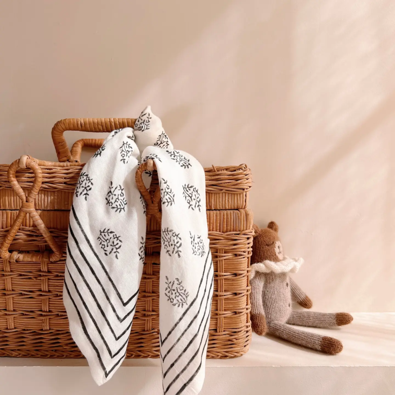 Ce foulard est confectionné artisanalement grâce à la technique indienne du block-print, les couleurs sont réalisées à partir de pigments naturels. Cette confection manuelle peut entraîner certaines irrégularités qui en font le charme en le rendant unique ♡