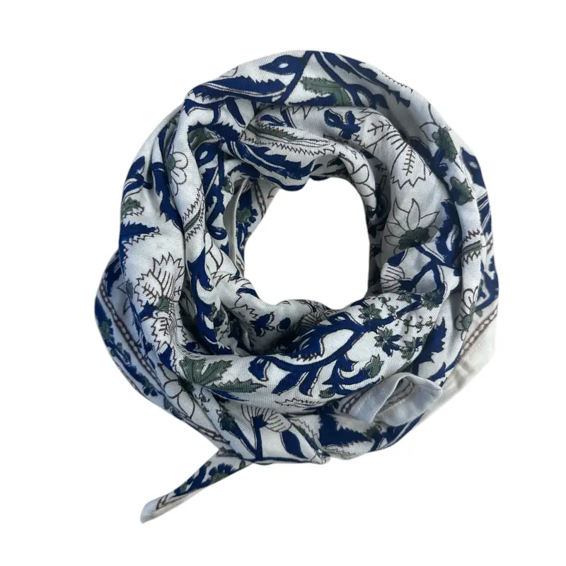 Ce foulard très souple et doux est confectionné artisanalement grâce à la technique indienne du block-print, les couleurs sont réalisées à partir de pigments naturels.