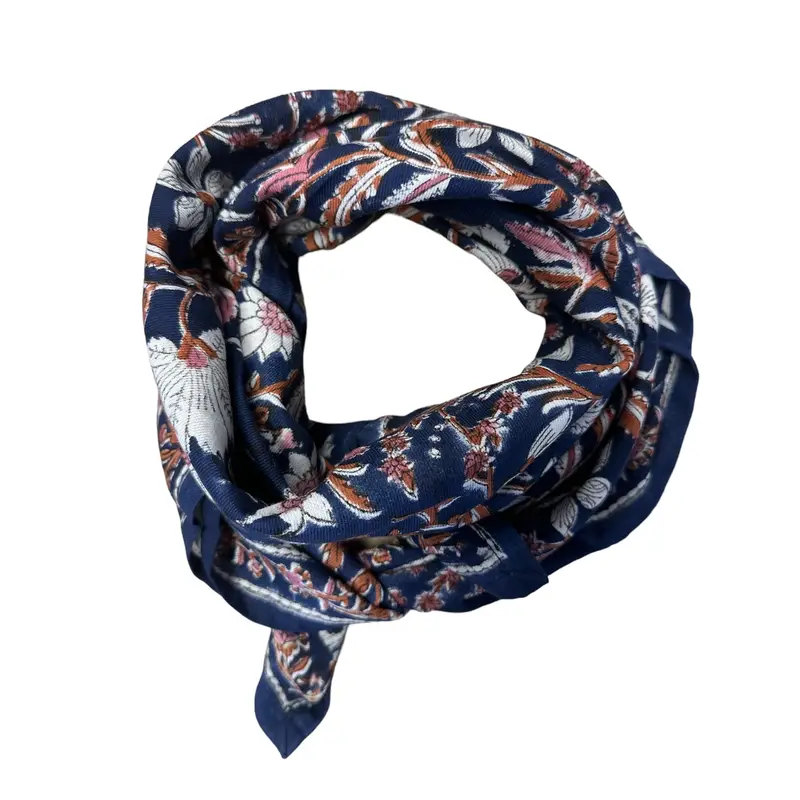 Ce foulard est confectionné artisanalement grâce à la technique indienne du block-print, les couleurs sont réalisées à partir de pigments naturels. Cette confection manuelle peut entraîner certaines irrégularités qui en font le charme en le rendant unique ♡