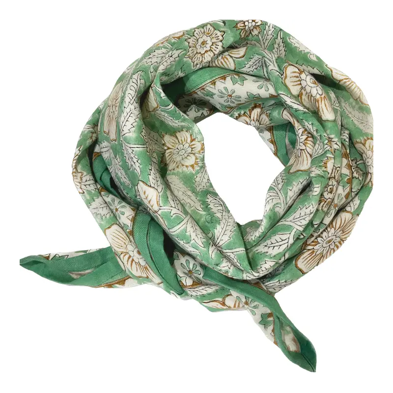 Ce foulard est confectionné artisanalement grâce à la technique indienne du block-print, les couleurs sont réalisées à partir de pigments naturels.