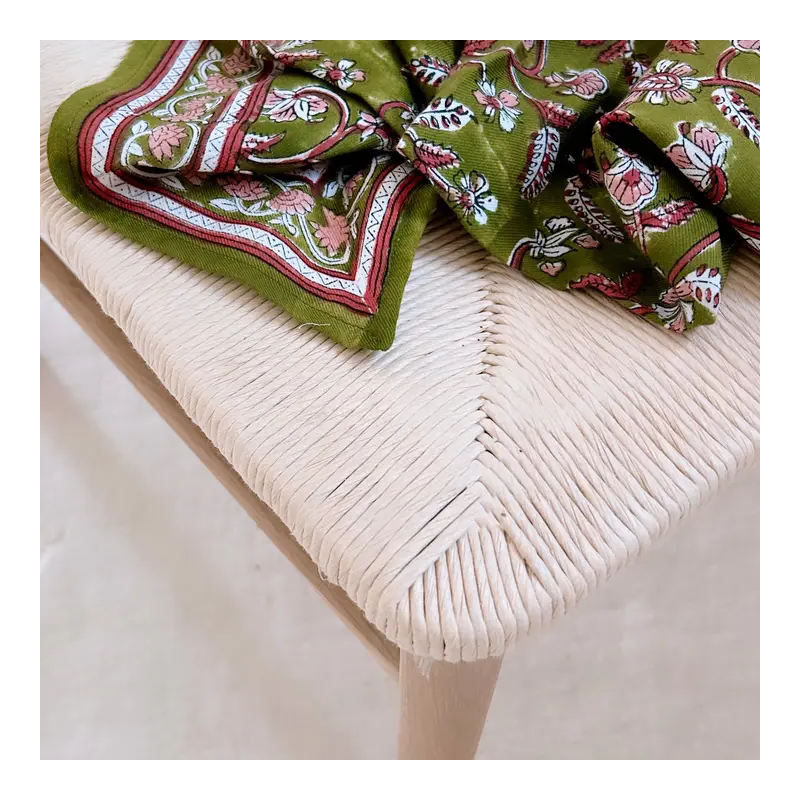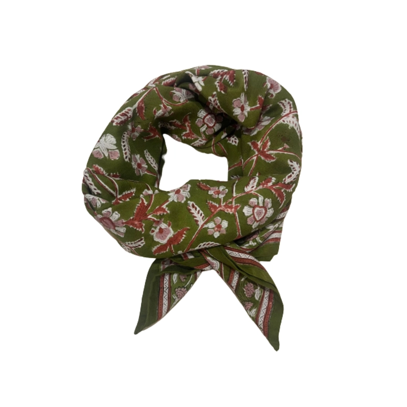 Ce foulard est confectionné artisanalement grâce à la technique indienne du block-print, les couleurs sont réalisées à partir de pigments naturels.