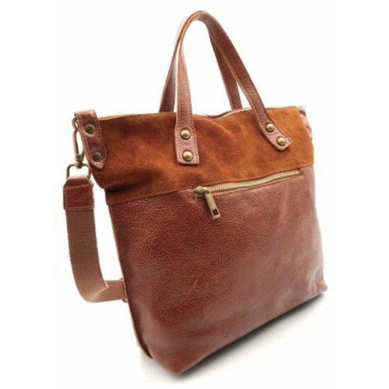 Sac à main issu de la marque CARAMELO composé de cuir camel et de croute de cuir de la même teinte. Ce sac est livré avec une bandoulière en cuir camel.