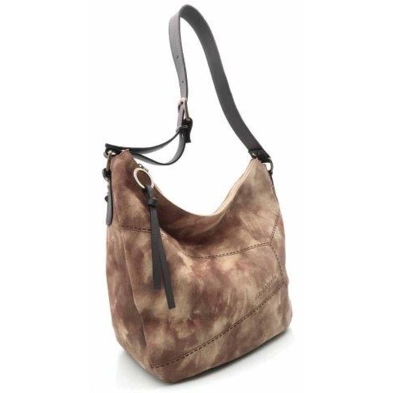 Sac porté épaule issu de la marque CARAMELO composé de Croute de Cuir Sable et de cuir au niveau de ses anses.