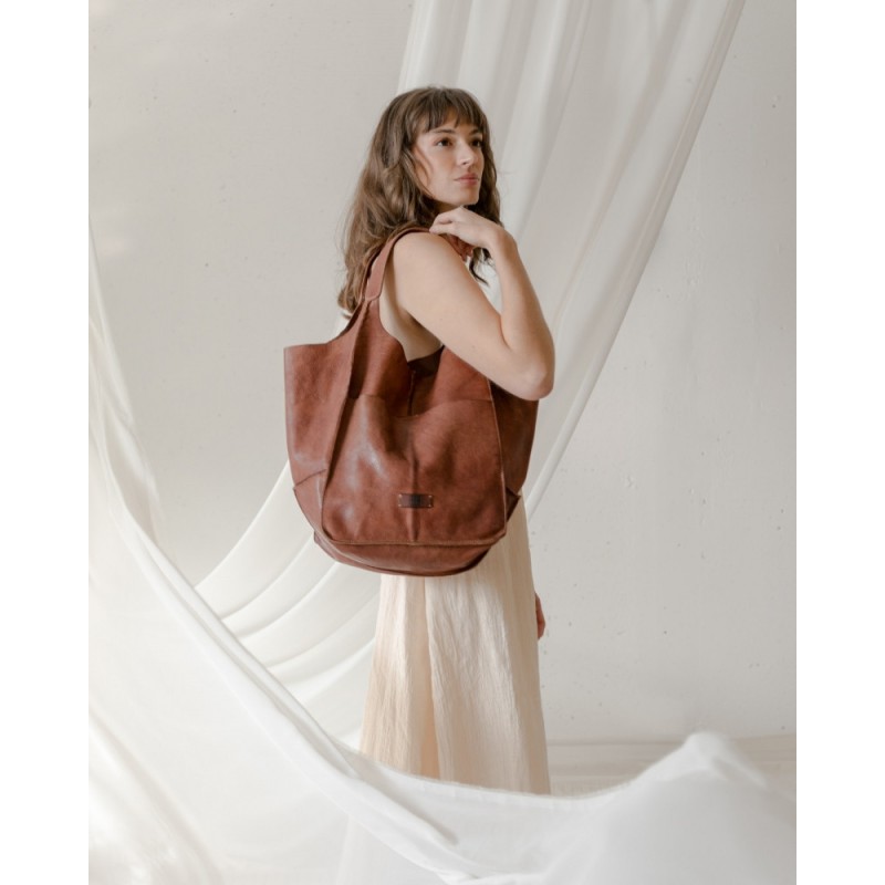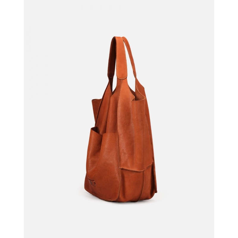 Sac Cabas Homer en cuir Tan issu de la marque BIBA en cuir de vachette lavé et tanné végétal. Fermeture pression. Poches extérieures et intérieures. Doublure en coton.