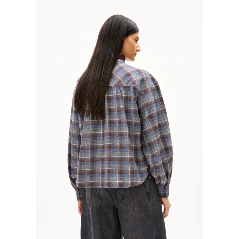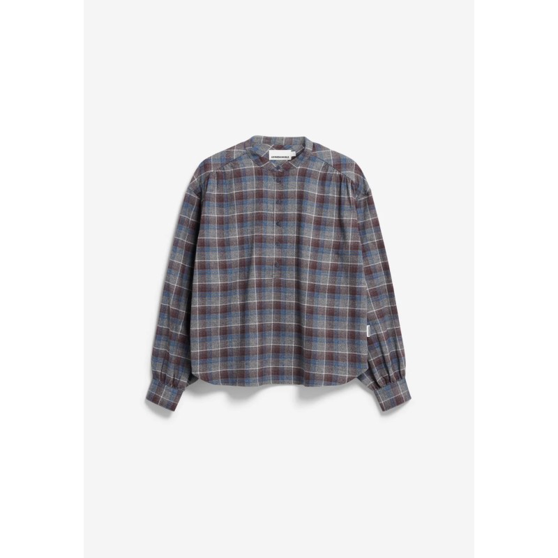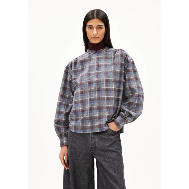 Notre blouse EFINARAA CHECK, confectionnée dans une étoffe tissée de poids moyen, séduit par ses épaules tombantes, son col montant et de délicates fronces.